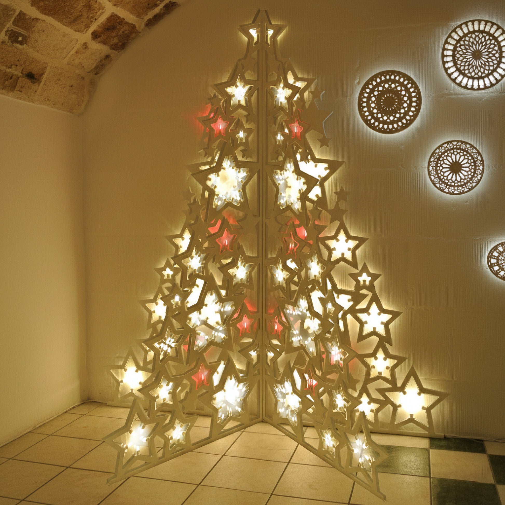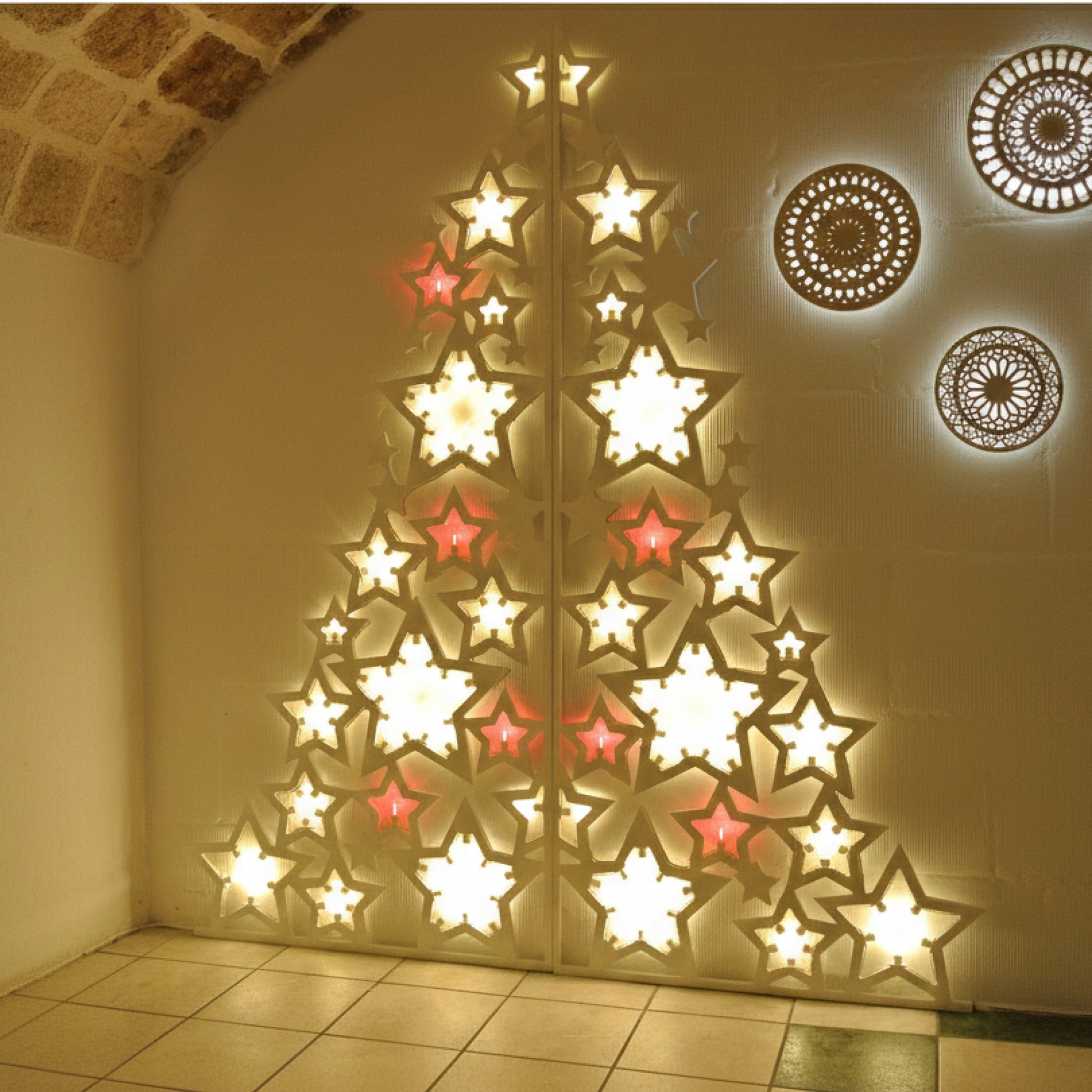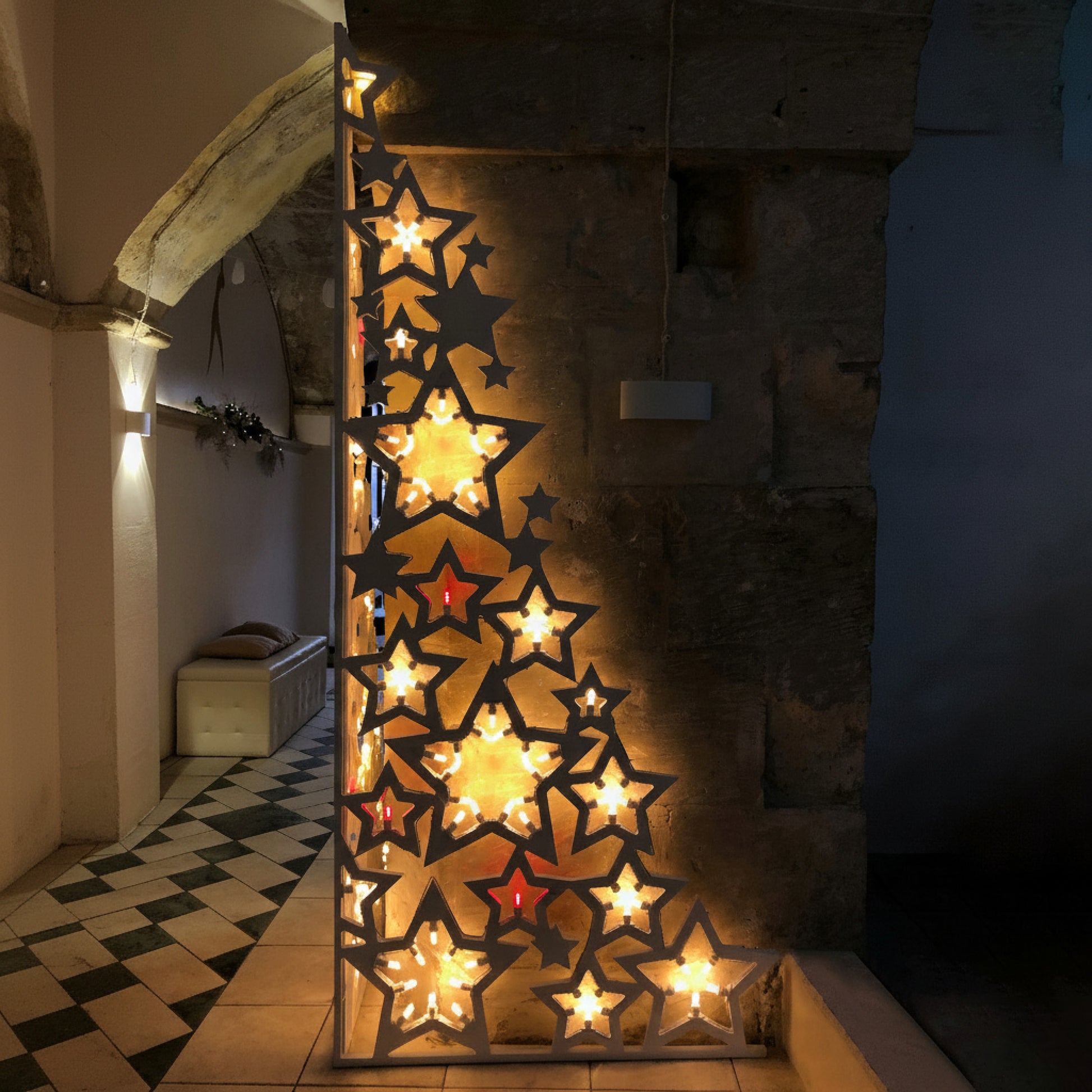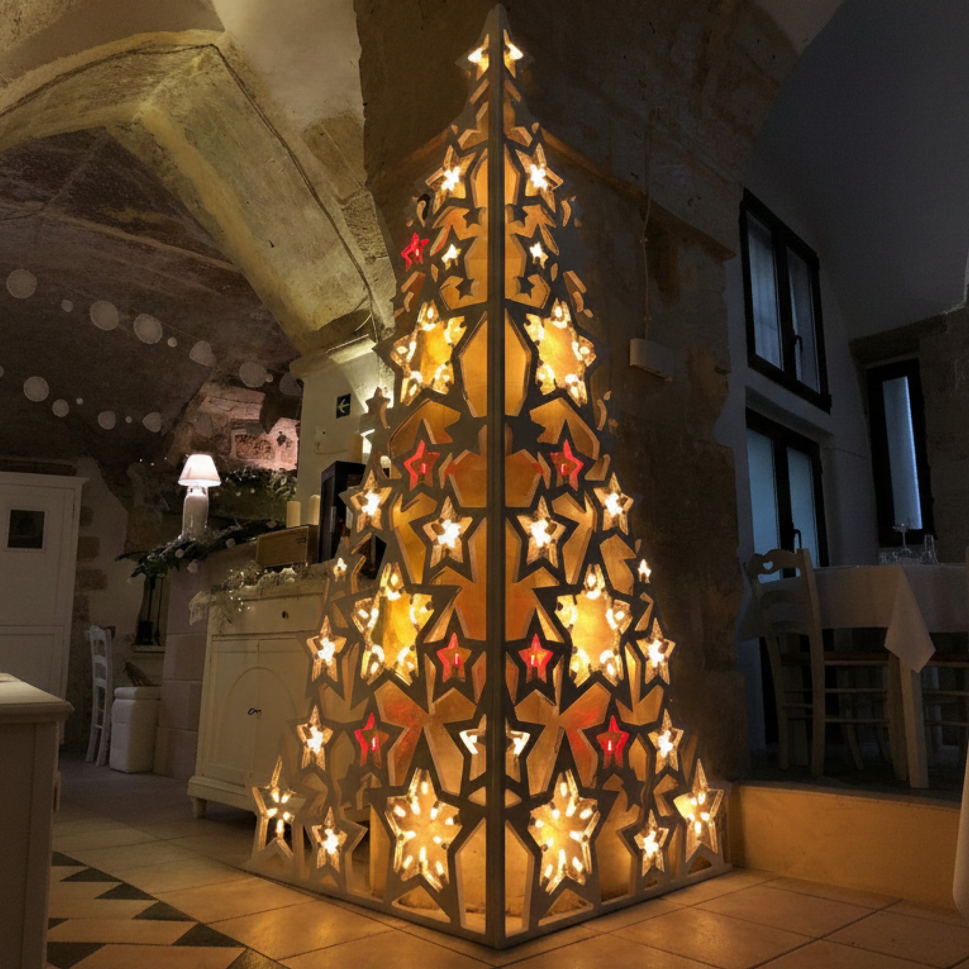 L’Albero di Stelle è una luminaria natalizia dal design essenziale che reinterpreta il tradizionale albero di Natale attraverso una sequenza armoniosa di stelle luminose. Le forme geometriche in legno e LED a basso consumo creano un gioco di pieni e vuoti che dona profondità, eleganza e un effetto scenografico immediato.