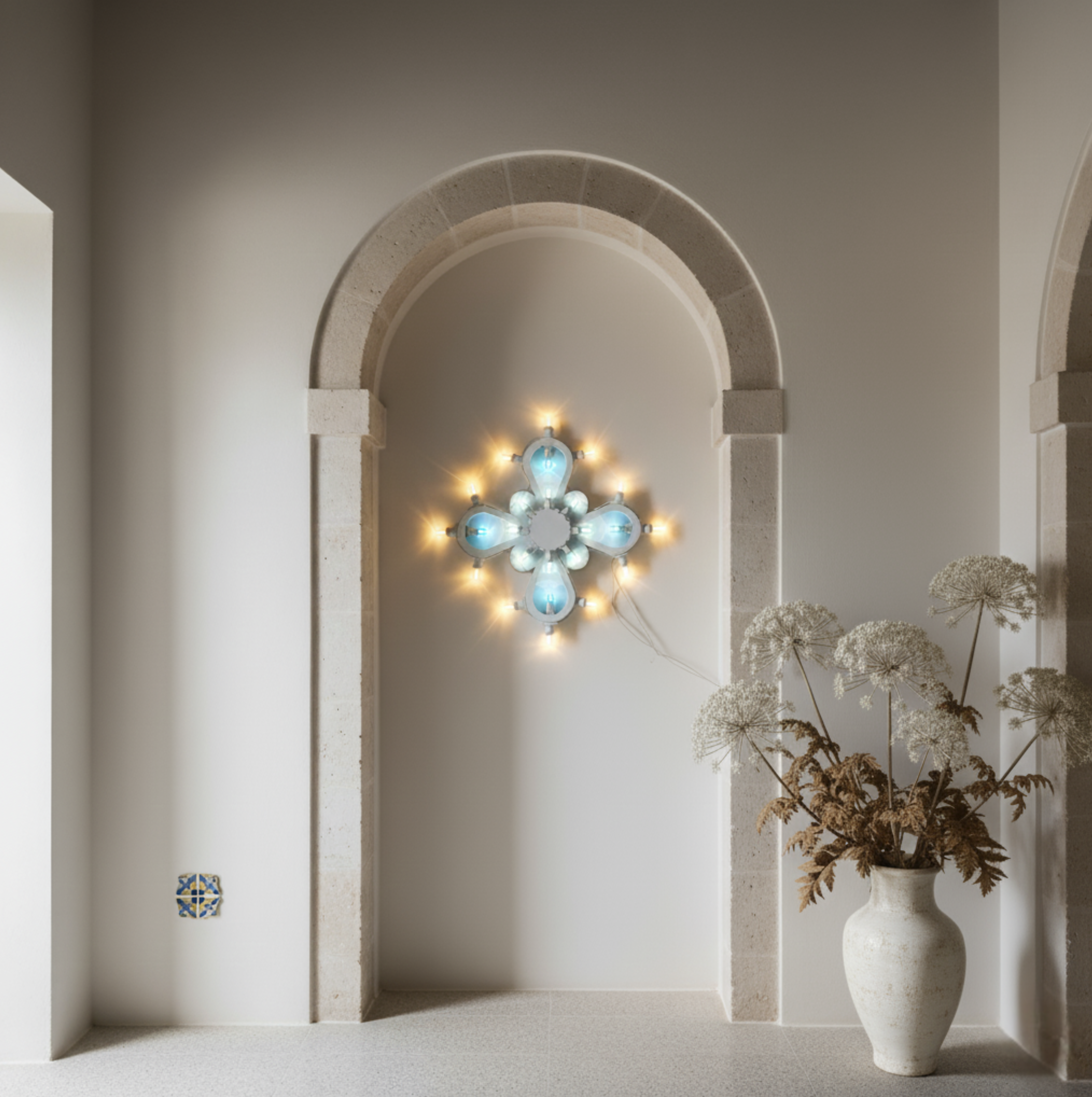 Giglio dei Saraceni is a striking wall light inspired by the symbolism of the lily. The elegant, symmetrical design recalls ancient ornamental motifs, enriched with perforated details that lend lightness and visual appeal. Designed to enhance interior walls, entryways, or important architectural settings, it uses E14 bulbs.