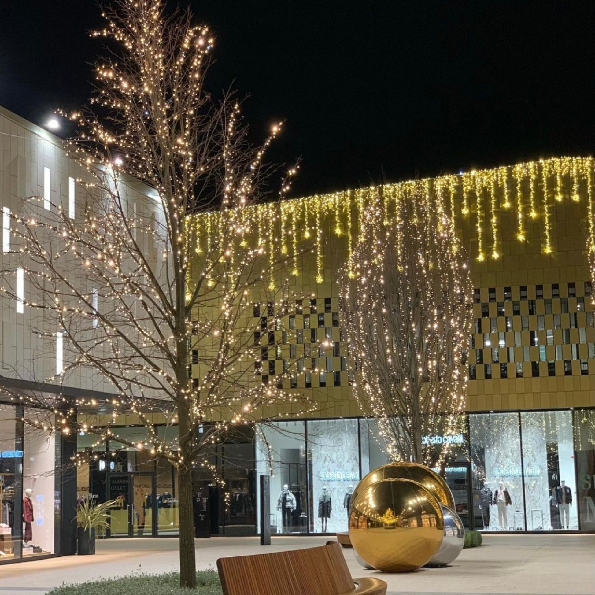 Decorate your home by creating a cascade of cold white lights using our LED garlands. Due to their high quality, our LED strings can also be used for outdoor decorations, to illuminate the facades of buildings or shops. One of the many lighting solutions for commercial activities proposed by the Studio Light Mariano artisans.