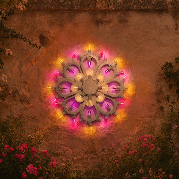 Fior di Lecce est un luminaire qui réinterprète la fleur à huit pétales, symbole récurrent de l'architecture baroque de Lecce. Son design ornemental perforé crée un effet lumineux saisissant, mettant en valeur avec élégance les murs intérieurs ou les porches. Il fonctionne avec des ampoules E14, diffusant une lumière chaleureuse qui sublime l'atmosphère. Entièrement fabriqué à la main dans le Salento, Fior di Lecce allie histoire, savoir-faire et fonctionnalité dans un seul objet décoratif. Dimensions : 60 x 60 cm.
